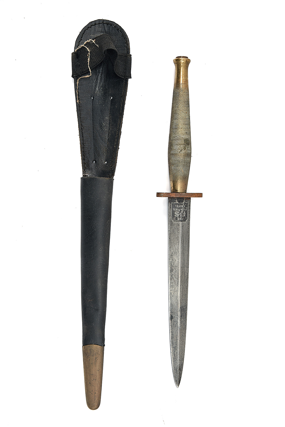 A GOOD REPRODUCTION FIRST PATTERN FAIRBAIRN SYKES FIGHTING KNIFE, circa 1980s, likely an Indian copy, with 7 in. unsharpened double-edged steel blade, ricasso stamped 'THE / F S / FIGHTING / KNIFE', steel cross-guard, brass hilt with chequered grip, together with its black leather scabbard with brass chape, rust patches on blade, cross-guard rusted, tabs removed from scabbard, 13 3/4 in. overall