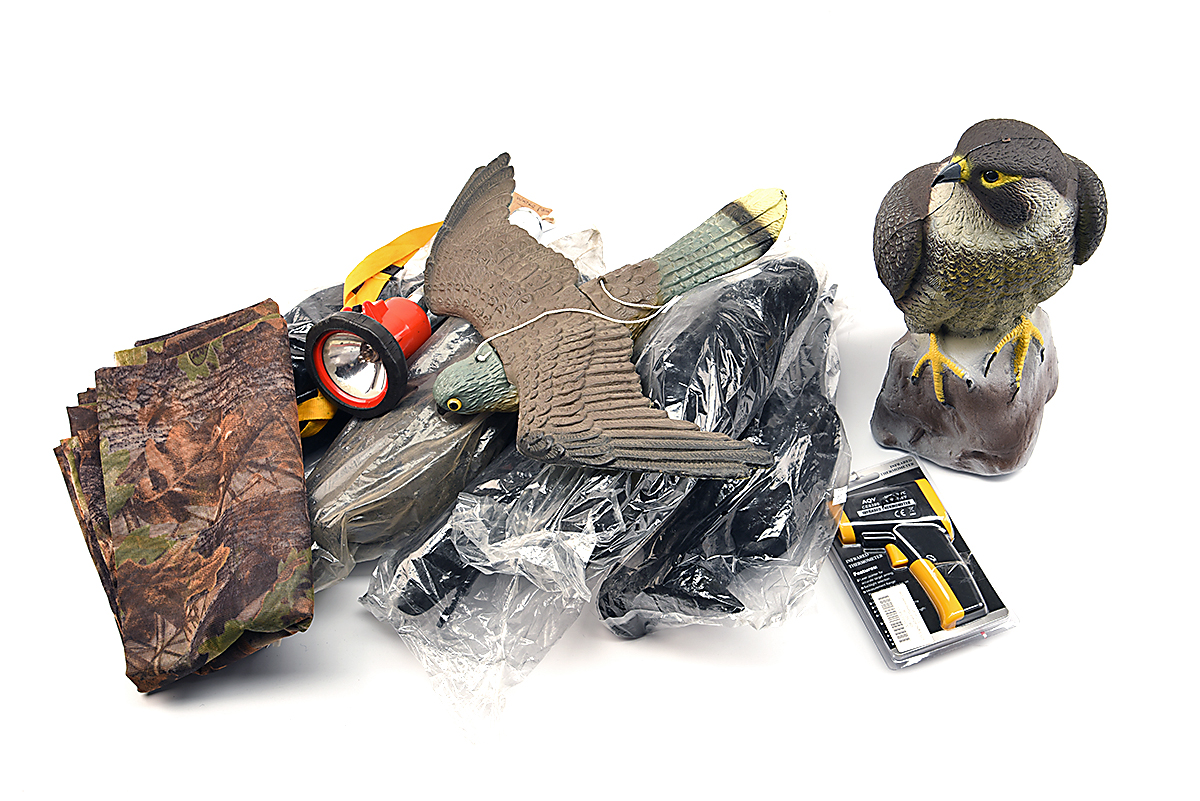 A QUANTITY OF SHOOTING RELATED ITEMS, comprising of a vintage waterproof torch, 5 x unused plastic crows, a plastic kestrel, plastic peregrine, an infrared thermometer