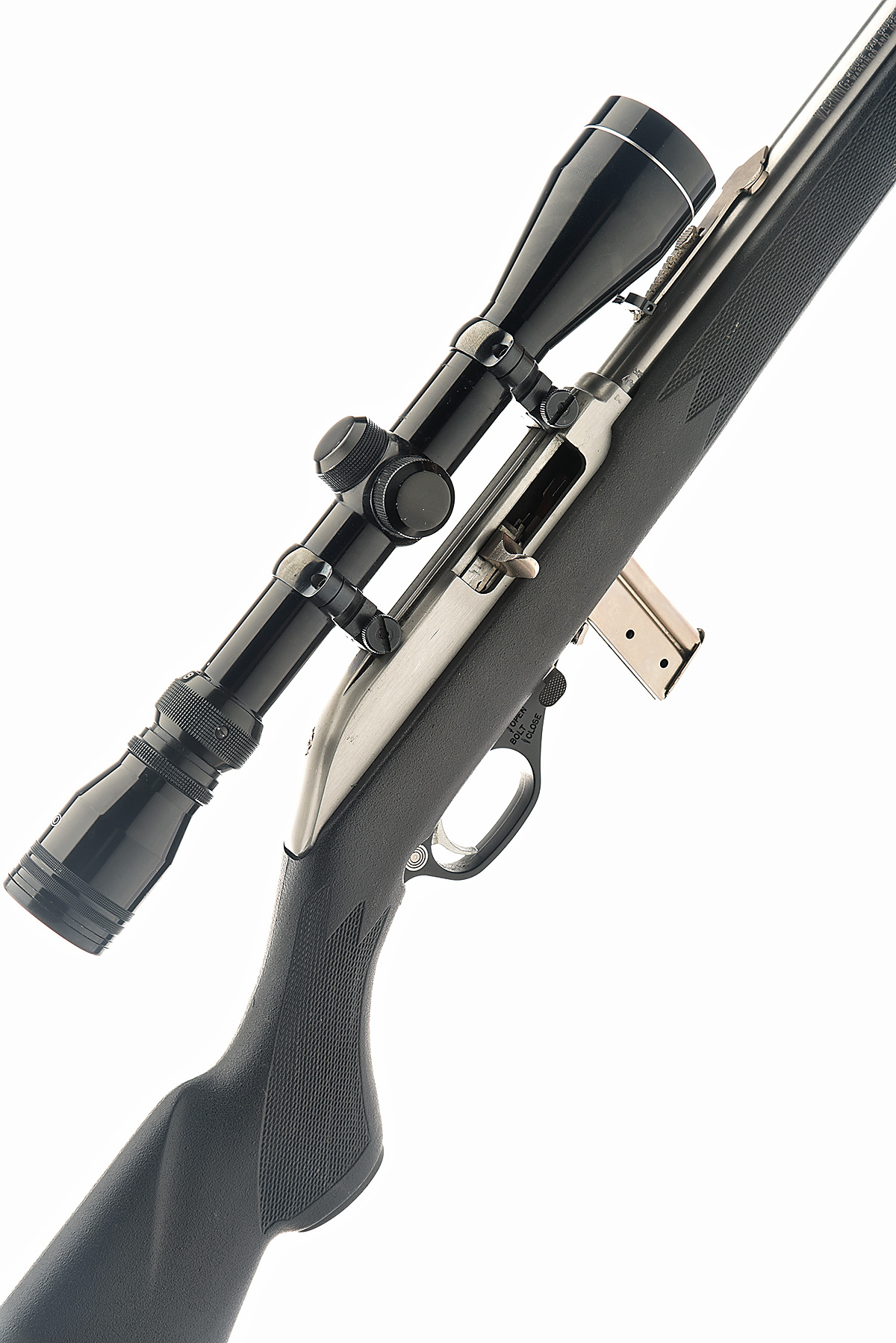THE MARLIN FIREARMS CO. .22 L.R. 'MODEL 995SS' SELF-LOADING SPORTING RIFLE, serial no. 04220012, circa 1996, 18in. stainless nitro barrel, threaded for sound moderator, fore-sight missing, lear rear-sight,. fitted with a Tasco 3-9x 40 telescopic sight, manual safety, detachable magazine, pistolgrip synthetic stock, sling eyes