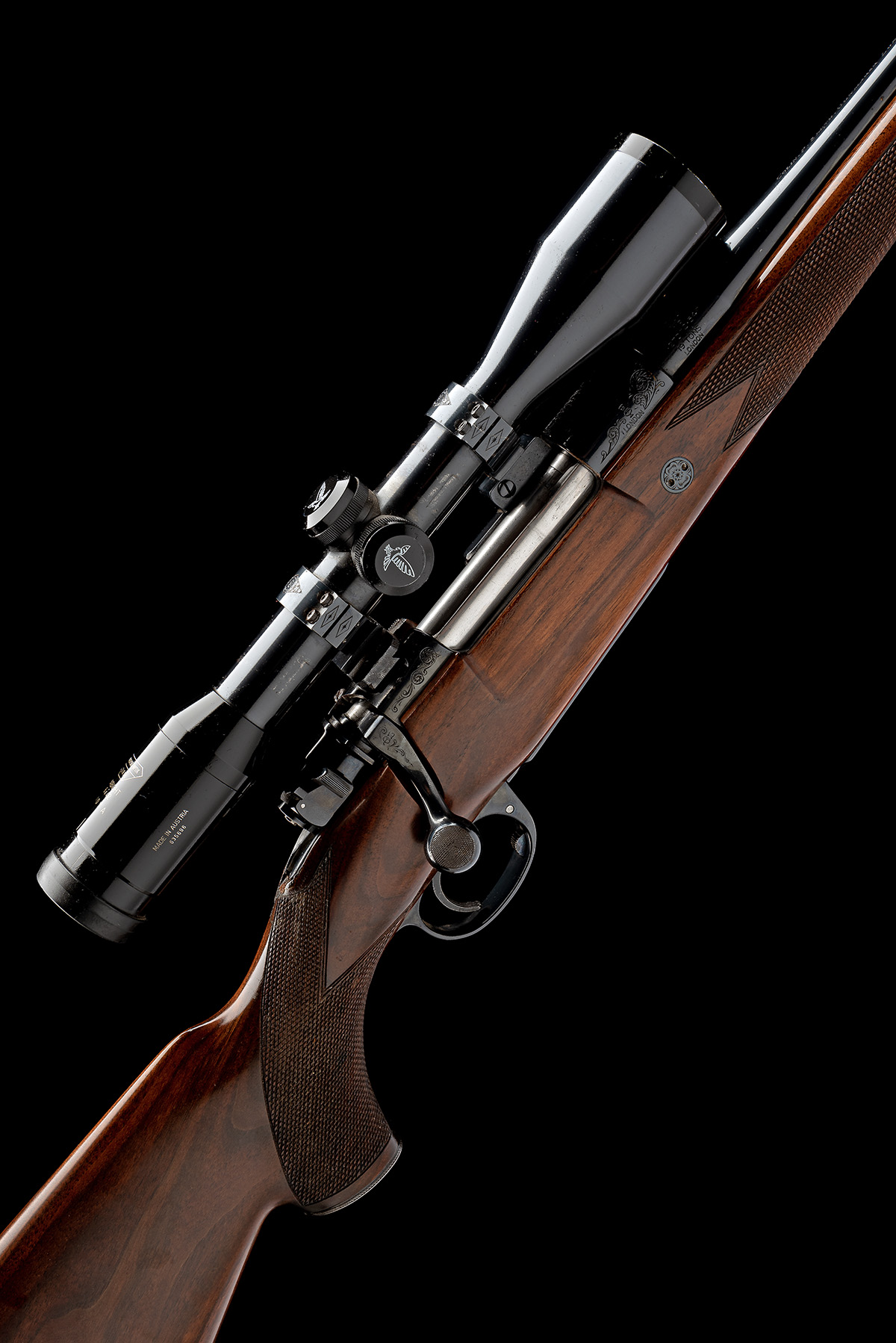 for 1984, 21 1/4in. unsighted nitro barrel engraved 'COLIN. P SMITH GUNMAKER LONDON', the receiver (with thumb cutout) mounted with a Swarovski Optik Habicht 6x42 Nova telescopic sight, serial no. 635696, in Holland & Holland style quickly-detachable side mounts, some floral and acanthus scroll engraving, the sidewall retaining original mauser Oberndorf A/N details, florally-engraved recoil blocks, hinged floorplate with push button release, figured pistolgrip stock with cheekpiece and raised comb, sling eyes, steel pistolgrip-cap, horn finial, steel heel and toe plates, light repairs to wood to rear of top tang, 14in. pull, weight 7lb. 9oz. (unscoped) and 8lb. 13oz. (with scope)