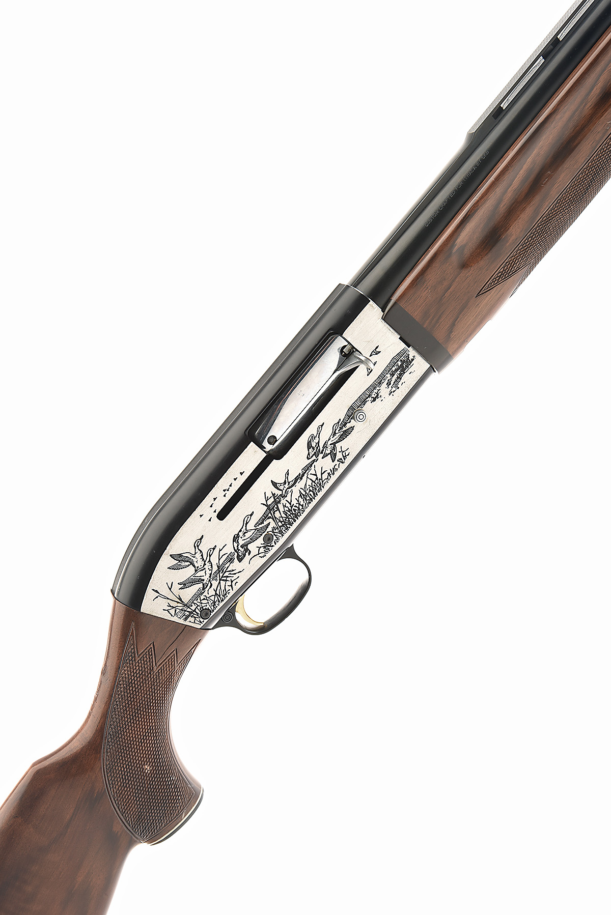 SKB FOR ITHACA GUN CO. 12-BORE 'LIGHTNING' SEMI-AUTO SHOTGUN, serial no. S7325396, circa 1980, restricted magazine, 28in. nitro reproved barrel (in 2023), with 9mm raised ventilated matt top-rib, 2 3/4in. chamber, bored approx. 1/2 choke, manual push-button safety, gold-washed trigger, blacked action with silver side panels with naive game scene engraving, 14in. pistolgrip stock including buttplate