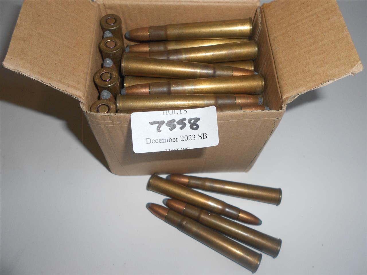 65 LOOSE ROUNDS .375 MAGNUM RIMMED AMMUNITION BY KYNOCH, BULLET WEIGHT UNKNOWN, SLIGHT DISCOLOURATION, JACKETED SN, NVBN Please be advised that cartridges/ammunition, primers, primed cases, blanks and percussion caps CANNOT BE SENT ANYWHERE in the UK or EXPORTED OVERSEAS by POST or CARRIER. Due to this NATIONAL and INTERNATIONAL CARRIER rule, within 30 days of the sale date, please arrange collection with our shipping department from our Norfolk HQ. If payment and collection is not arranged within 30 days of the sale date, that will indicate that the items are not required and they will be disposed of.