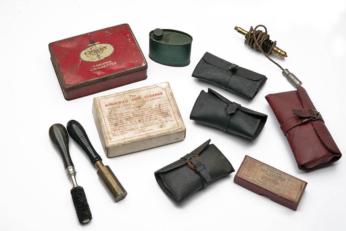 A GROUP OF VINTAGE SPORTING GUN CLEANING ITEMS, late 19th -early 20th Century, being x5 weighted pull-throughs, four cased including one 12-bore by Dixon & Sons; two 12-bore brushes, one by Hawksley and one by Lang & Son; an empty tin of Greenerene oil; a boxed Tomlinson gun cleaner scourer appearing unused; a boxed Bobinwad gun cleaner; a tin of various used brushes, mops and scourers