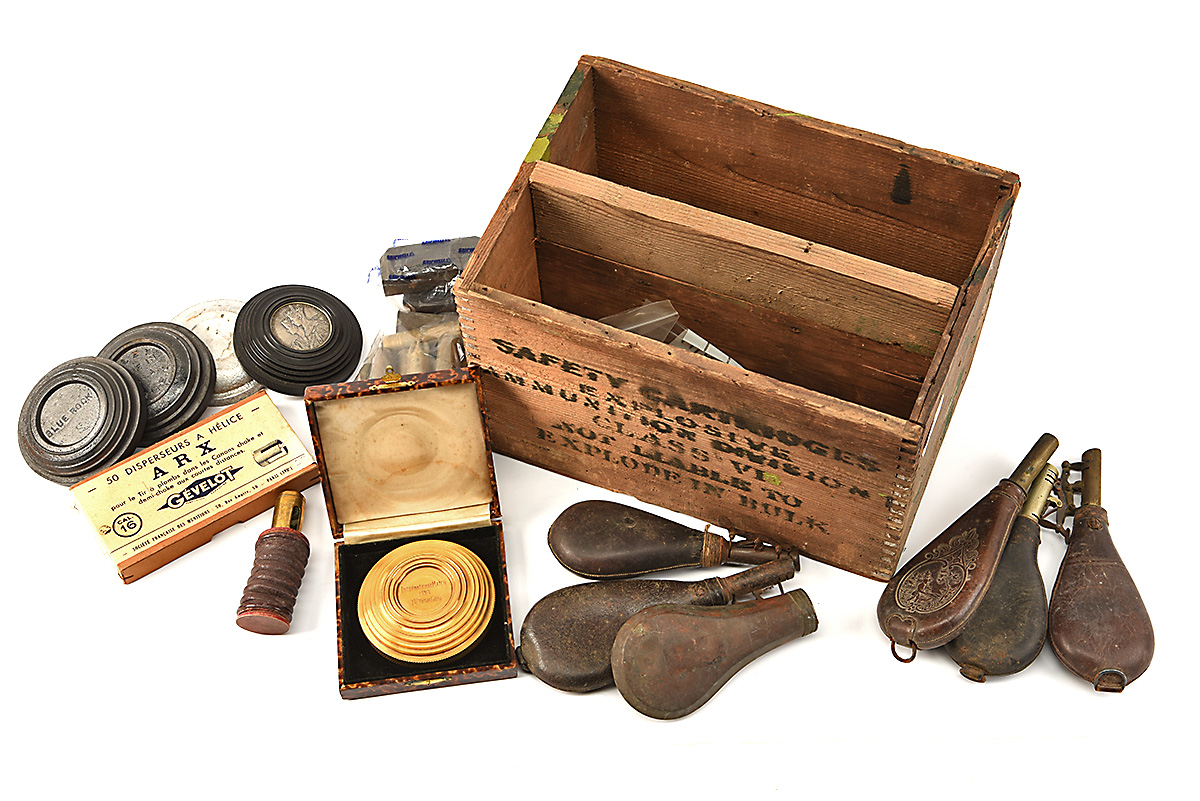 A MIXED GROUP OF VINTAGE PARTS AND ACCESSORIES, being two Rosson locks, an ICI long service medallion; a bellows duck call; a tin of springs and castings, a box of Gevelot helix wads, brass 12-bore cases, x4 printer's blocks, x5 leather shot flasks; x4 reusable metal clays, a cased brass clay engraved International Match / 1938 / 1st High Gun, etc. in a pine cartridge transportation box, very mixed conditions