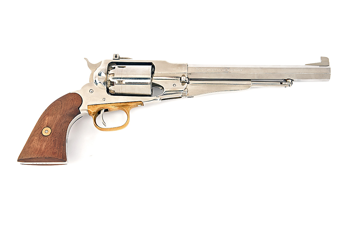 A REPRODUCTION PIETTA .44 PERCUSSION STAINLESS REMINGTON ARMY REVOLVER, serial no. 249279, with octagonal 8in. barrel, adjustable sights, plain cylinder , solid frame and smooth walnut grips