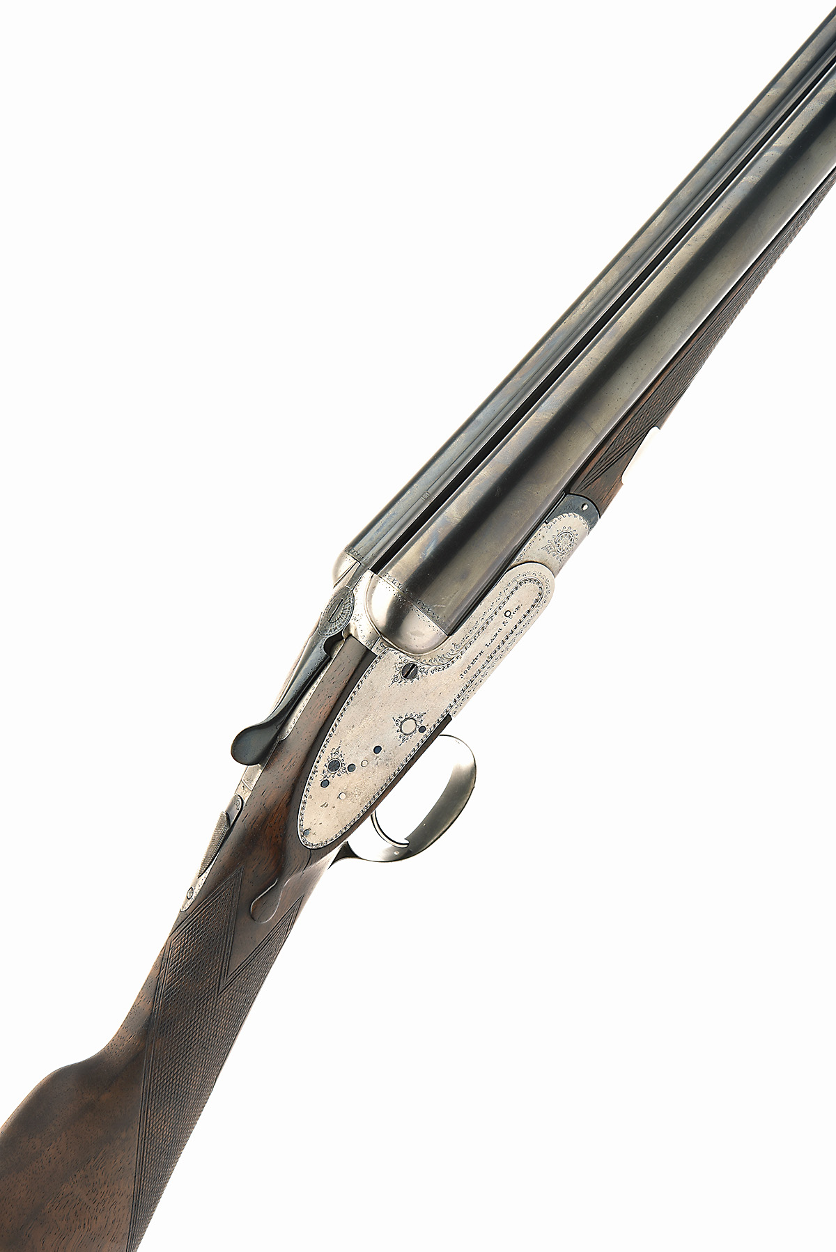 JOSEPH LANG & SON 12-BORE SINGLE-TRIGGER SIDELOCK EJECTOR, serial no. 14852, for 1910, 28in. sleeved nitro reproved barrels (in 2024), 2 1/2in. chambers, bored approx. imp. cyl. in both, treble-grip action, automatic safety with inlaid 'SAFE' detail, border engraving, brushed finish, 14 1/2in. stock including 1in. extension, weight 6lb. 10oz.