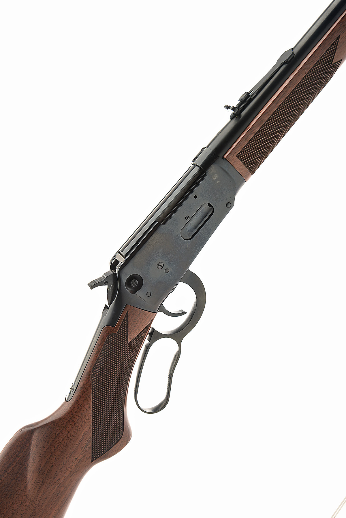 circa 2015, 24in. nitro barrel, block blade fore-sight, leaf rear-sight, manual safety, full-length tubular magazine, semi-pistolgrip figured stock, green canvas slip