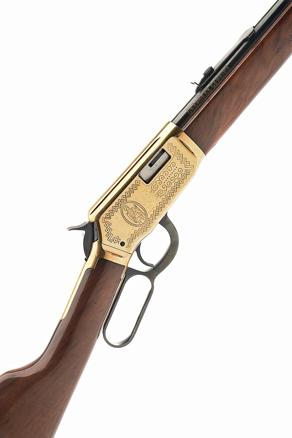 WINCHESTER .22 S.L. or L.R. 'MODEL 9422 CHEROKEE' LEVER-ACTION REPEATING SPORTING RIFLE, serial no. CKF3180, circa 1979, 20 1/2in. nitro barrel, ramp-mounted bead fore-sight, V rear-sight, gold-plated receiver grooved for a telescopic sight and engraved with a geometric border design surround a wester covered wagon and a native American with the legend 'TRAIL OF TEARS 1839' on the left hand side and a similar geometric border surrounding a western trapper on the right, walnut straight-hand butt-stock with chequered plastic heel-plate and an inlet cast medallion with a central bust of a native American with the word 'CHEROKEE' in the band, blued under-lever, walnut carbine fore-end with gold-plated barrel-bands and blued full-length magazine, brown slip