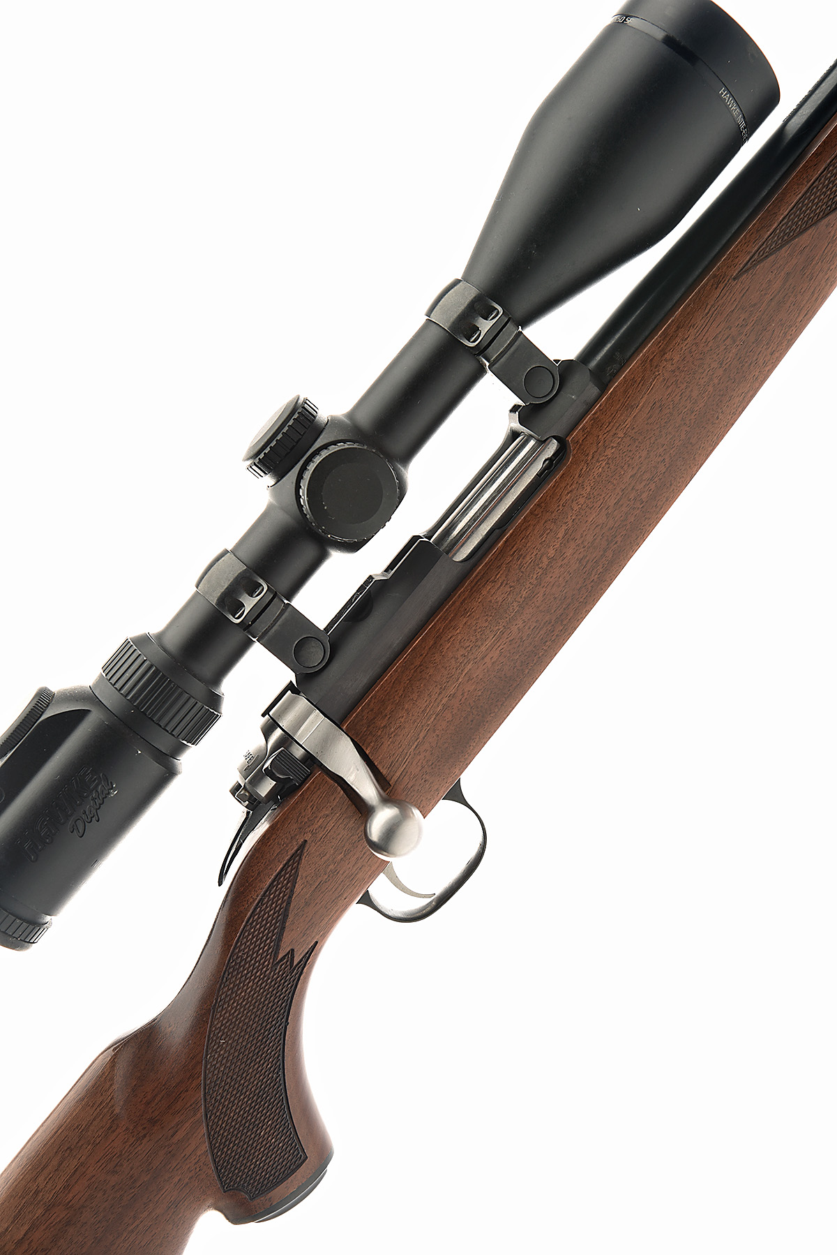 RUGER .17 HMR '77/17' BOLT-MAGAZINE SPORTING RIFLE, serial no. 703-11973, circa 2002, 16 1/2in. unsighted nitro barrel, threaded for sound moderator, fitted with 25mm scope rings, manual safety, fitted with a Hawke Nite eye digi-IR 3-12x50 telescopic sight, detachable magazine, pistolgrip stock, sling eyes