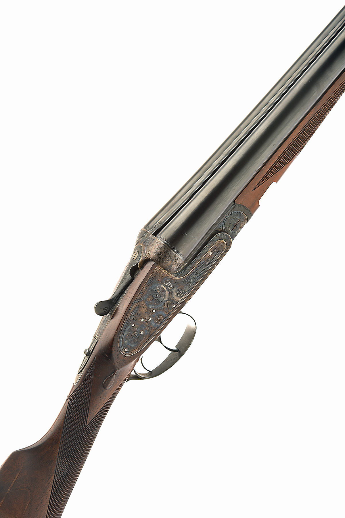 LAURONA 12-BORE HAND-DETACHABLE SIDELOCK EJECTOR, serial no. 117795, dated 1973, 27 3/4in. nitro barrels, 2 3/4in. chambers, bored approx. 1/2 and full choke, treble-grip action with hidden third bite, removable striker discs, automatic safety, hand-detachable lockplates, cocking-indicators, articulated front trigger, border and acanthus scroll engraving with floral bouquets, 14 1/2in. stock, weight 6lb. 7oz.