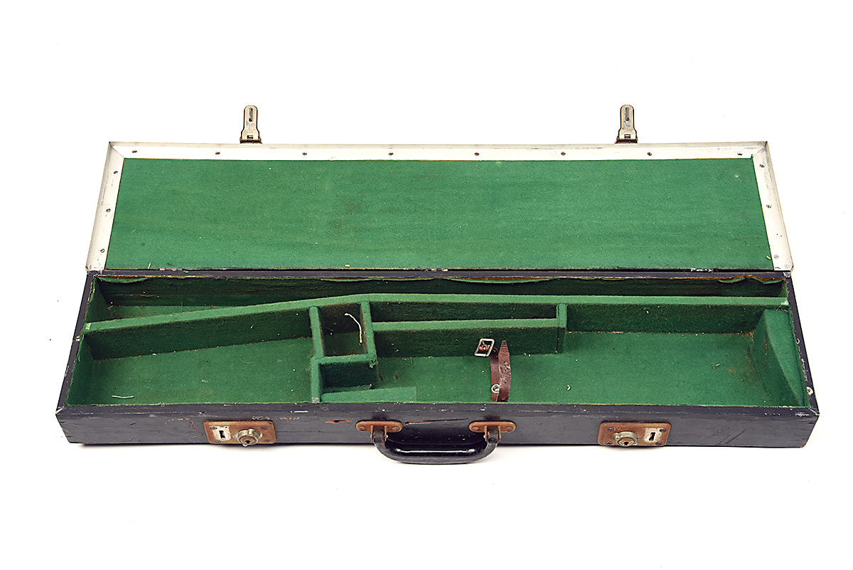 A WOODEN SINGLE GUNCASE, of handmade, homemade, wooden and aluminium construction, fitted for 31in. barrels, lined in green baize, 2 locking steel catches (no keys), painted black, with name painted 'J. GARLAND' on dirty cream background