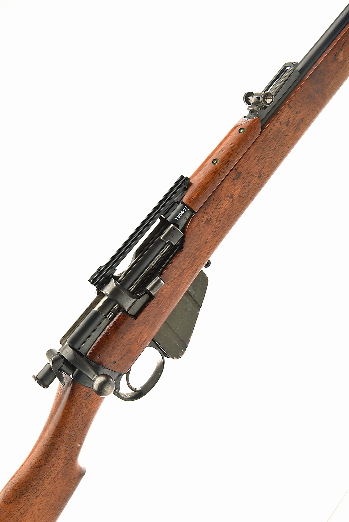 * B.S.A. .303 'L.E. MK I' BOLT-MAGAZINE SERVICE RIFLE, serial no. 19097, circa 1900, 30 1/8in. nitro barrel, ramp-mounted barley-corn fore-sight, folding ladder rear-sight, scope rail, manual bolt safety, magazine cut-off, detachable box magazine, full-length stock, brass butt plate with trap door, sling swivels