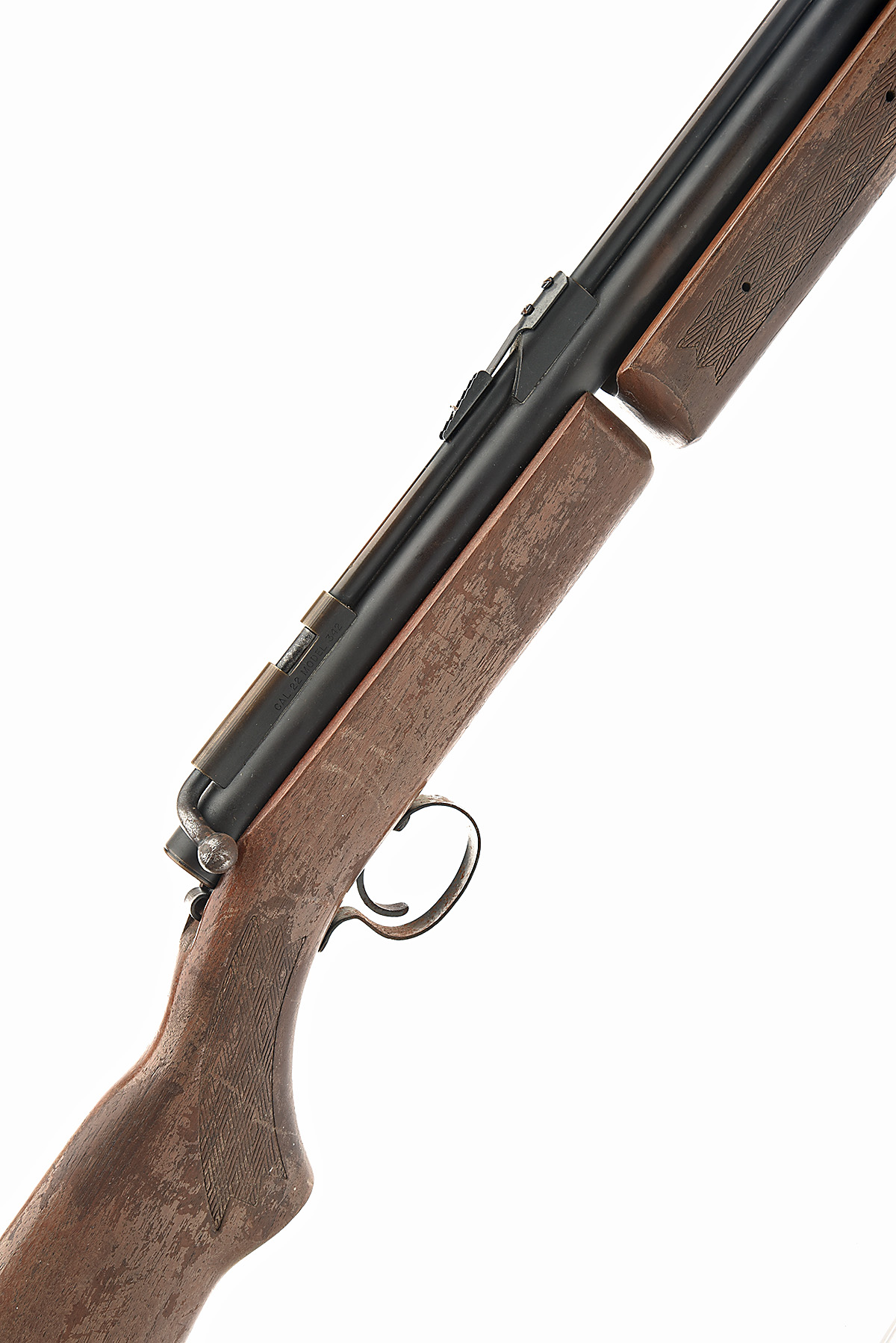 TWO .22 AIR-RIFLES FOR SPARES OR REPAIR, the first a BENJAMIN FRANKLIN Model 342 .22 multi-pump pneumatic serial no. 106149 (lightly worn, pins crudely replaced, action weak), the second a RELUM Model Tornado under-lever in .22, no visible serial number (some pins replaced, action fails to cock, finish lightly worn)