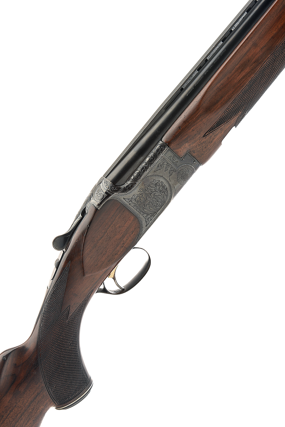 B.C. MIROKU 12-BORE SINGLE-TRIGGER OVER AND UNDER EJECTOR, serial no. 602488, circa 1973, 30in. nitro barrels with 10mm ventilated matt top-rib, 2 3/4in. chambers, bored approx. true and imp. cyl., hold-open toplever, manual safety with integral barrel selector switch, gold-washed single trigger, beaded border and acanthus scroll engraving, 14 3/4in. pistolgrip stock including 1in. ventilated rubber recoil pad, weight 8lb. 2oz.
