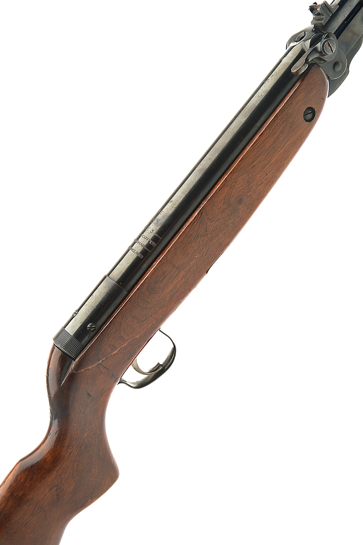 A .22 WEBLEY & SCOTT MK3 UNDER-LEVER AIR-RIFLE, serial no. 28663, transitional type circa 1959, with blued 18 1/2in. sighted barrel, tap-action breech with moulded handle, plain air-chamber without telescopic sight rail, walnut rounded half-stock with plain fore-end (the underside cracked and repaired) and push button under-lever, strong amount of finish