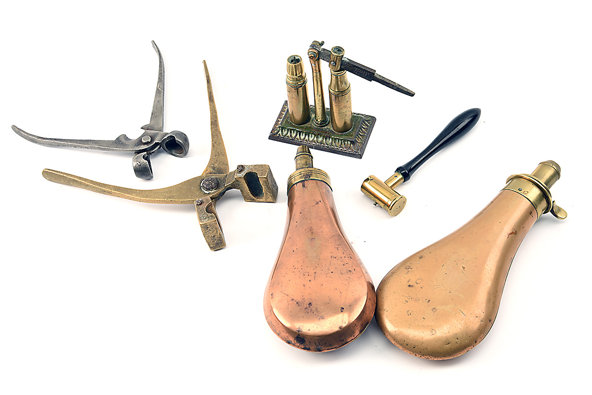 A MIXED GROUP OF SIX VINTAGE ACCESSORIES, being 1) a James Dixon capper/de-capper; 2) a brass powder measure/scoop; 3) an iron scissor mould 4) a brass scissor mould; 5) a copper and brass plain bag powder flask by James Dixon; 6) a copper and brass embossed powder flask, mixed condition, some faults