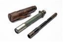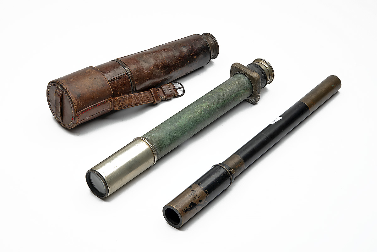 A MIXED GROUP OF THREE VINTAGE TELESCOPES, being 1) a 19th Century nickelled single draw marked 'HEATH & Co. Ltd / Makers to the Royal Navy / CRAYFORD LONDON / 8175 / MADE FOR / JAS. MURRAY & Co. / CALCUTTA', with sun-shield, missing leather cover, 24 1/2 in. fully extended, 13 1/4 in. closed; 2) a brass 1914 dated three-draw, marked 'ROSS, LONDON / 1914' with Broad Arrow, and 'TEL SIG (Mk III) ALSO G. S. / No. 4588', leather worn with losses, 31 3/4 fully extended, 10 3/4 closed; 3) military sighting scope dated 1943, marked 'No. 22D MK I / AK&S 1943 / O.S. 813GA No. 49878' with Broad Arrow beneath, 15 in.