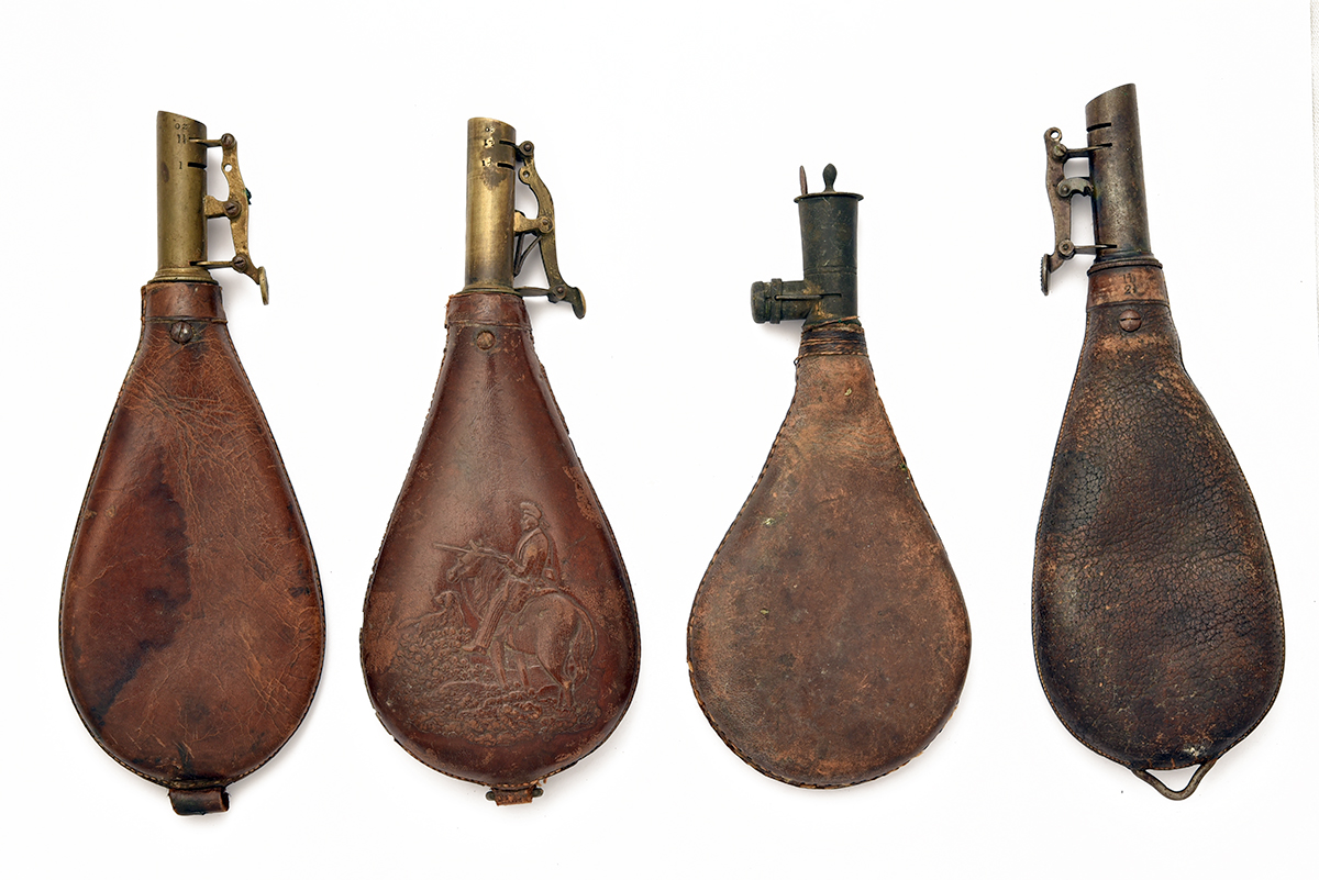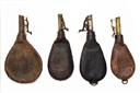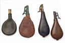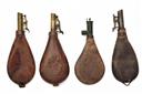 A MIXED GROUP OF 15 SHOT FLASKS FOR PARTS OR RESTORATION, mixed periods and in a very mixed condition, worn with broken springs, cut-offs and stitching, etc.