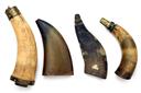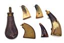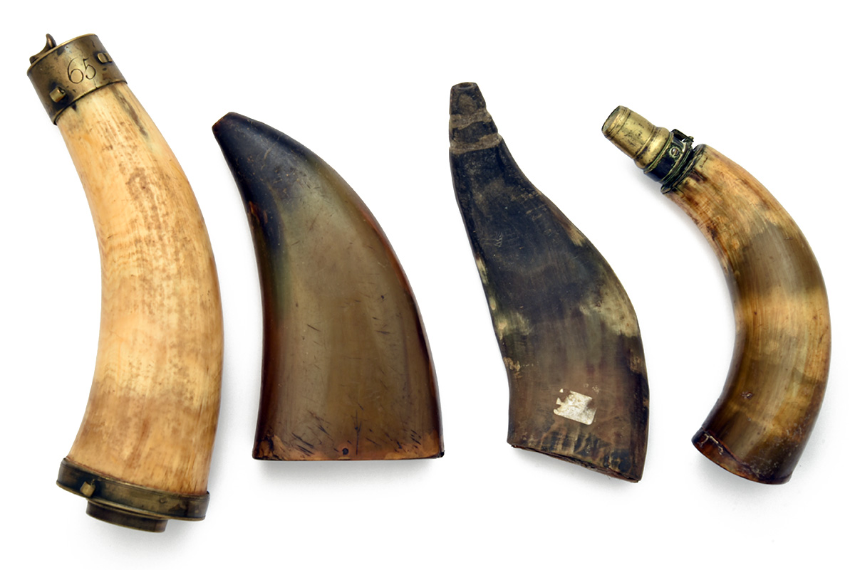 A GROUP OF 10 MIXED CONDITION POWDER FLASK AND HORNS,