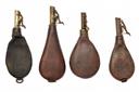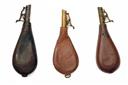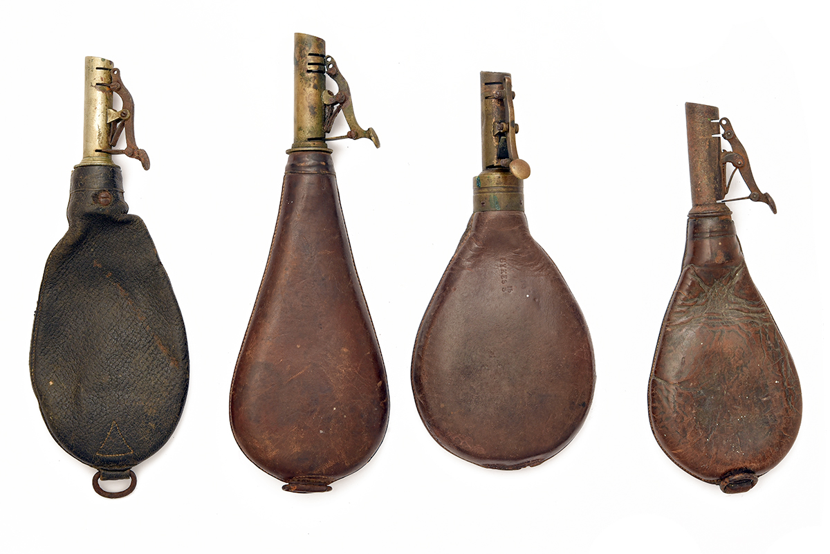 A GROUP OF SEVEN SHOT FLASKS, circa late 19th Century, varying degrees of wear with tight stitching and working springs