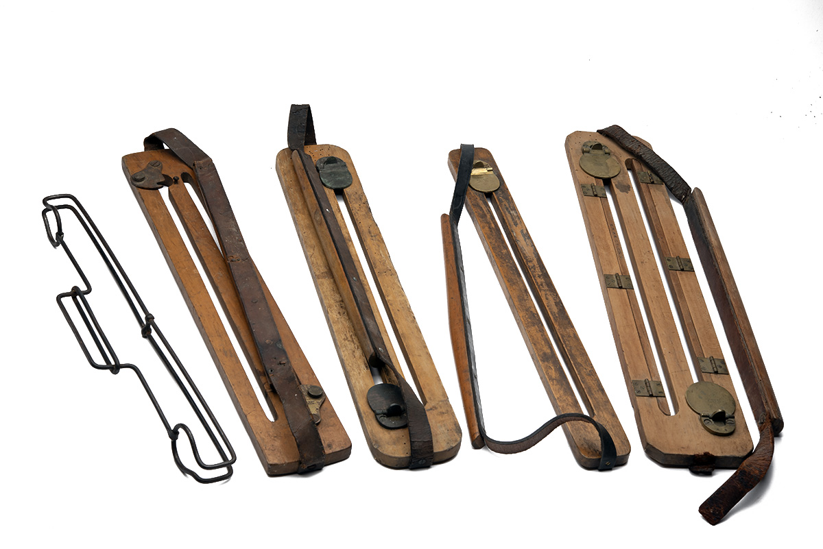 A GROUP OF FIVE RARE GAME CARRIERS BY JAMES DIXON & SONS, circa late 19th Century, 1) rare steel Jonas's Patent 'Simplex', unmarked but retailed by Dixon and appearing in their period catalogues; 2) rare Combination double-carrier, with hinged slots to allow smaller game to be held, both hinged gates marked 'JAMES DIXON / & SONS / SHEFFIELD' with trumpet and banner trade-mark, leather strap deteriorated and broken at one end, some worming; 3) a double-carrier with horizontal screw gates marked 'JAMES DIXON / & SONS / SHEFFIELD'; 4) a double-carrier with both hinged gates marked 'JAMES DIXON / & SONS / SHEFFIELD' with trumpet and banner trade-mark, some worming; 5) single carrier with hinged gate marked 'JAMES DIXON / & SONS / SHEFFIELD' with trumpet and banner trade-mark; NB - this trademark was used between 1879-1890