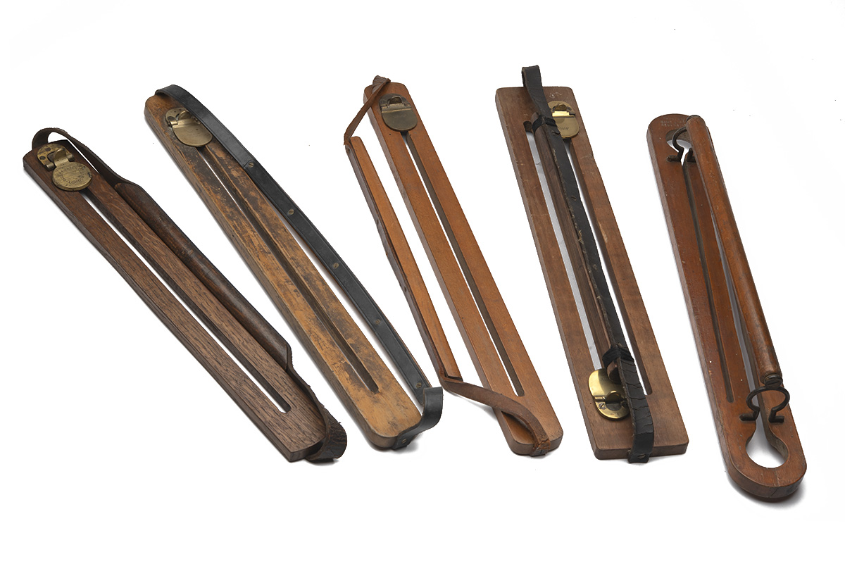 A GROUP OF FIVE BETTER NAMED GAME CARRIERS, circa late 19th Century, being 1) double-carrier with hinged gates marked 'A & NC . S Ltd / LONDON'; 2) a single carrier with hinged gate marked 'A & NC . S Ltd / LONDON'; 3) a single carrier with hinged gate marked JAMES DIXON / & SONS / SHEFFIELD; 4) a single carrier with hinged gate marked 'BUSSEY - PATENTEE - LONDON', 5) a double-carrier marked '"FREEMAN" / GAME CARRIER / REGd. No. 148189', designed to allow birds with damaged heads to be hung by the legs