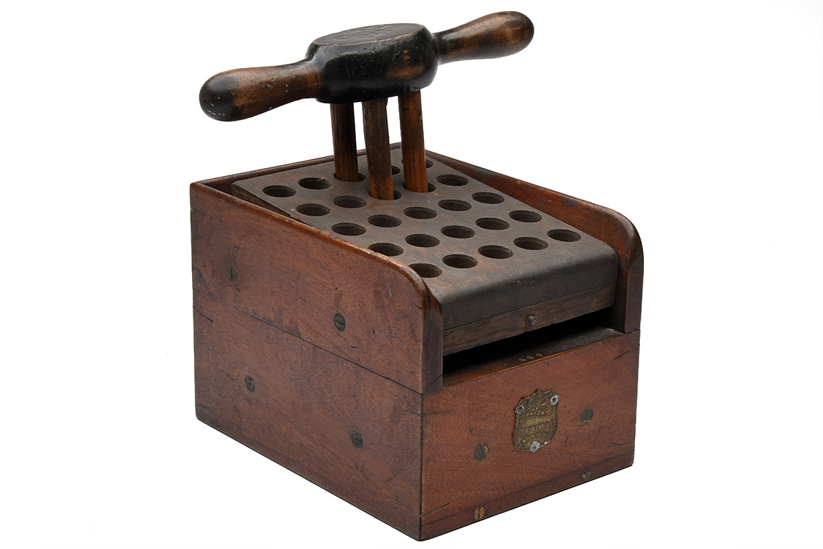 A RARE SIZE 25 ERSKINE PATENT CARTRIDGE LOADER, circa late 19th-early 20th Century, mahogany, wit brass label to the front reading 'PATENT / J. ERSKINE & Co. / NEWTON STEWART', together with a four-pronged rammer