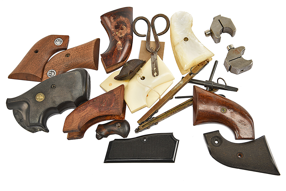 A COLLECTION OF 8 PAIRS OF VARIOUS PISTOL GRIPS, 3 UNPAIRED & SOME TOOLS,