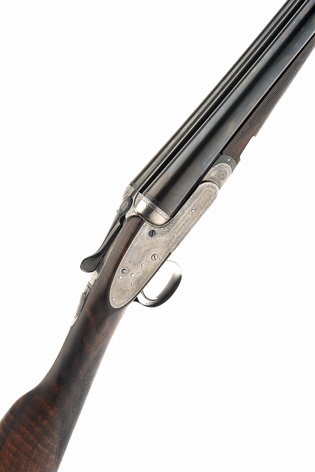 JOSEPH LANG 12-BORE 12-BORE SINGLE-TRIGGER SIDELOCK EJECTOR, serial no. 14248, for 1910, 28in. nitro barrels, rib engraved 'JOSEPH LANG & SON. 102 NEW BOND STREET. LONDON', 2 1/2in. chambers, bored approx. true cyl. and 1/4 choke,treble-grip action, automatic safety with brass 'SAFE' plaque, cocking-indicators, non-selective single trigger, acanthus scroll border engraving, brushed finish, 14 1/8in. figured stock (crack at hand), weight 6lb. 10oz.