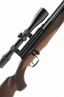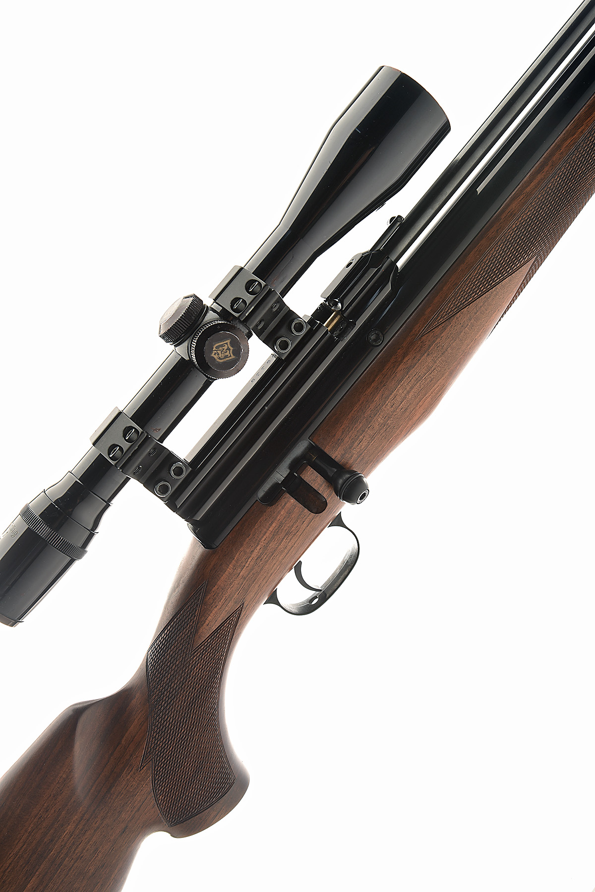 A .22 PRE-CHARGED PNEUMATIC AIR-RIFLE, SIGNED RWS 'MODEL EXCALIBRE', serial no. 06339, 24 3/4in. barrel including sound moderator, receiver fitted with a Nikko Stirling silver crown 4x40 telescopic sight, bolt-action, detachable rotary magazine with spare, blacked finish, chequered walnut pistolgrip stock with cheekpiece, 14 1/2in. pull including ventilated rubber recoil pad, in its makers ABS case with some pellets