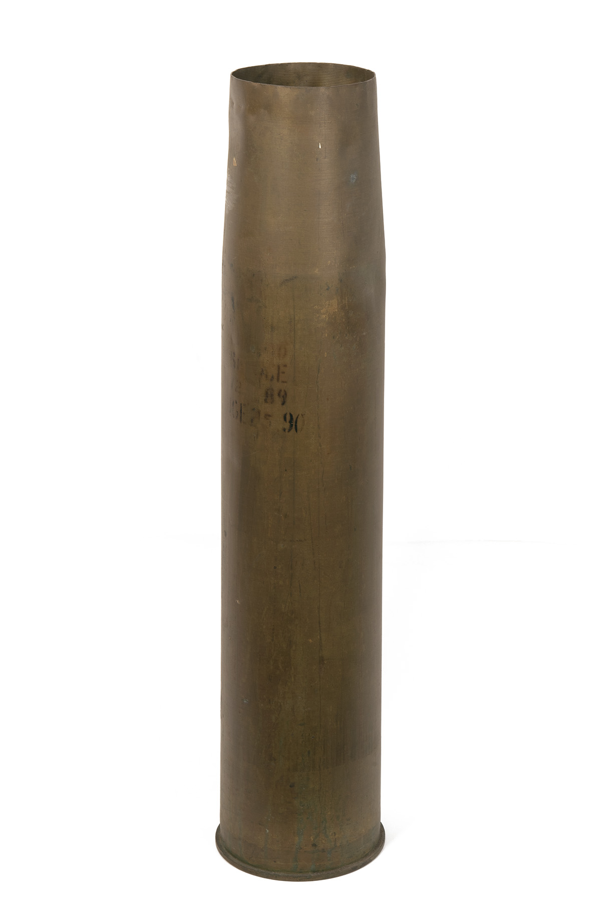AN UNKNOWN LARGE BRASS 5 1/2 INCH SHELL CASE, believed late 20th Century, 33 in. high, no base fuse, minimal head-stamping and faded black stencilling on the wall, some denting to the throat