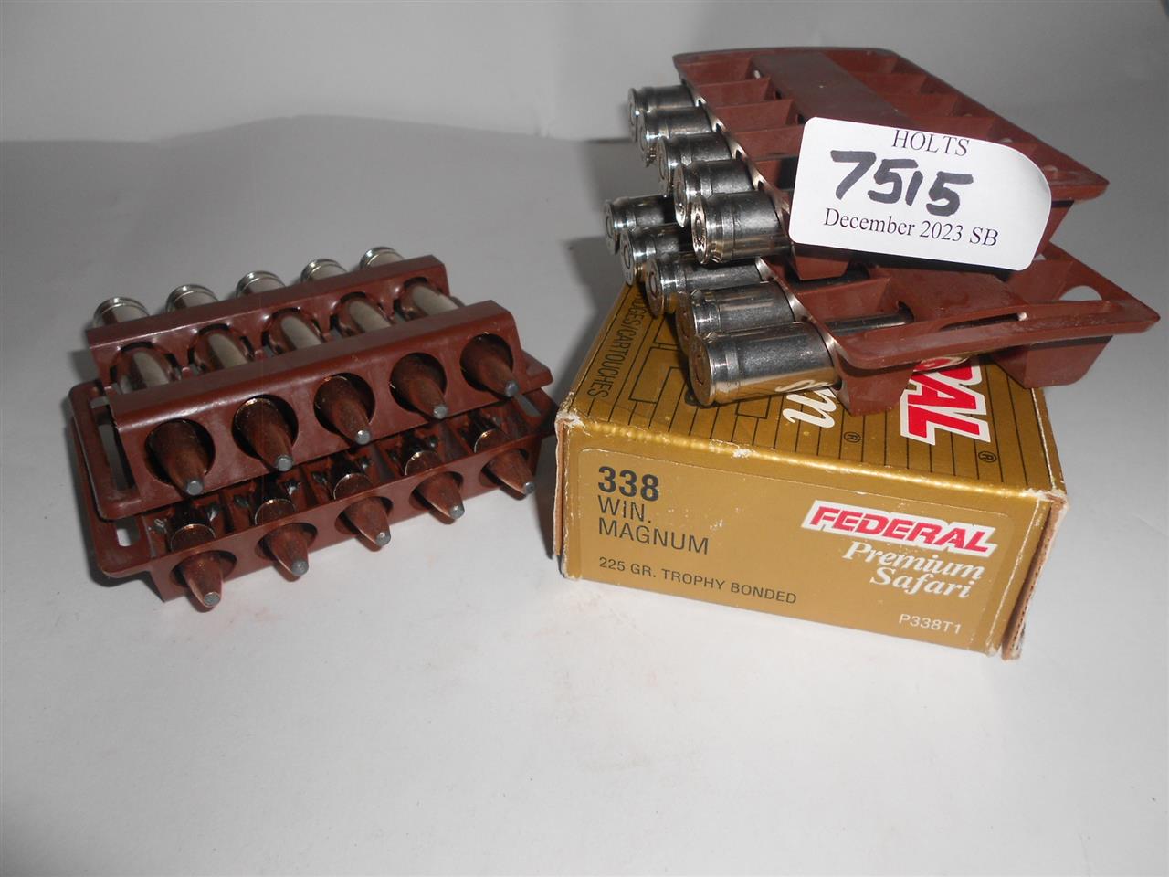 20 ROUNDS .338 WIN MAG AMMUNITION BY FEDERAL, 225grn TROPHY BONDED SP, #P338T1 BATCH 08916 Please be advised that cartridges/ammunition, primers, primed cases, blanks and percussion caps CANNOT BE SENT ANYWHERE in the UK or EXPORTED OVERSEAS by POST or CARRIER. Due to this NATIONAL and INTERNATIONAL CARRIER rule, within 30 days of the sale date, please arrange collection with our shipping department from our Norfolk HQ. If payment and collection is not arranged within 30 days of the sale date, that will indicate that the items are not required and they will be disposed of.