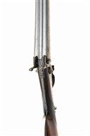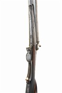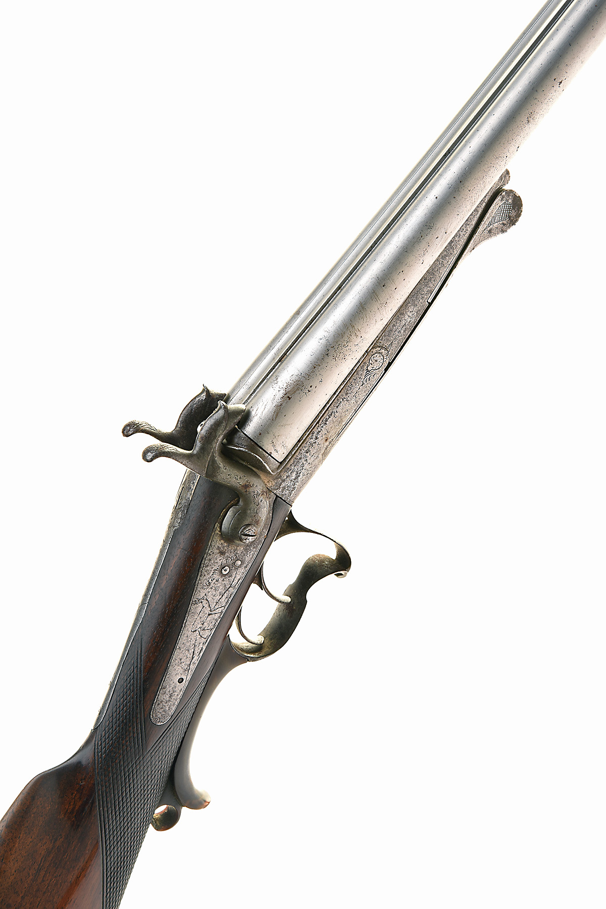 * A 16-BORE PINFIRE DOUBLE-BARRELLED SPORTING-GUN, UNSIGNED, serial no. 8079, Belgian, circa 1865, with 29 3/4in. barrels cleaned of finish, sparsely engraved frame and locks, forward facing under-lever and walnut butt-stock with iron splinter fore-end