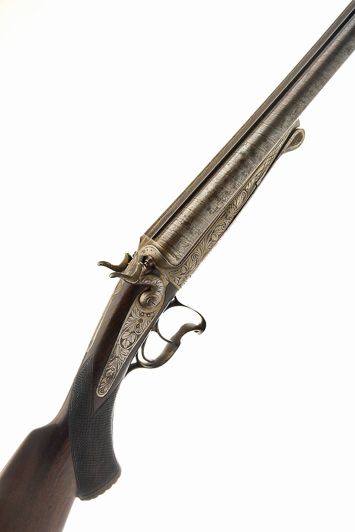 * A. BJERRE - ODENSE 16-BORE LEFAUCHEUX-TYPE HAMMERGUN, serial no. 3475 / 23, circa 1880, 30in. black powder only damascus barrels, file-cut matt rib, the tubes engraved 'A. BJERRE. ODENSE.', 2 1/2in. chambers, bored approx. true cyl. and 1/2 choke, right bore measurement marginal, carved percussion fences, back-action sidelocks with rebounding hammers, Lefaucheux-type forward facing underlever, border and bold acanthus scroll engraving, triggerguard with hand guard, 14in. pistolgrip stock with cheekpiece, horn pistolgrip cap, sling swivels, including buttplate, insert repair to toe