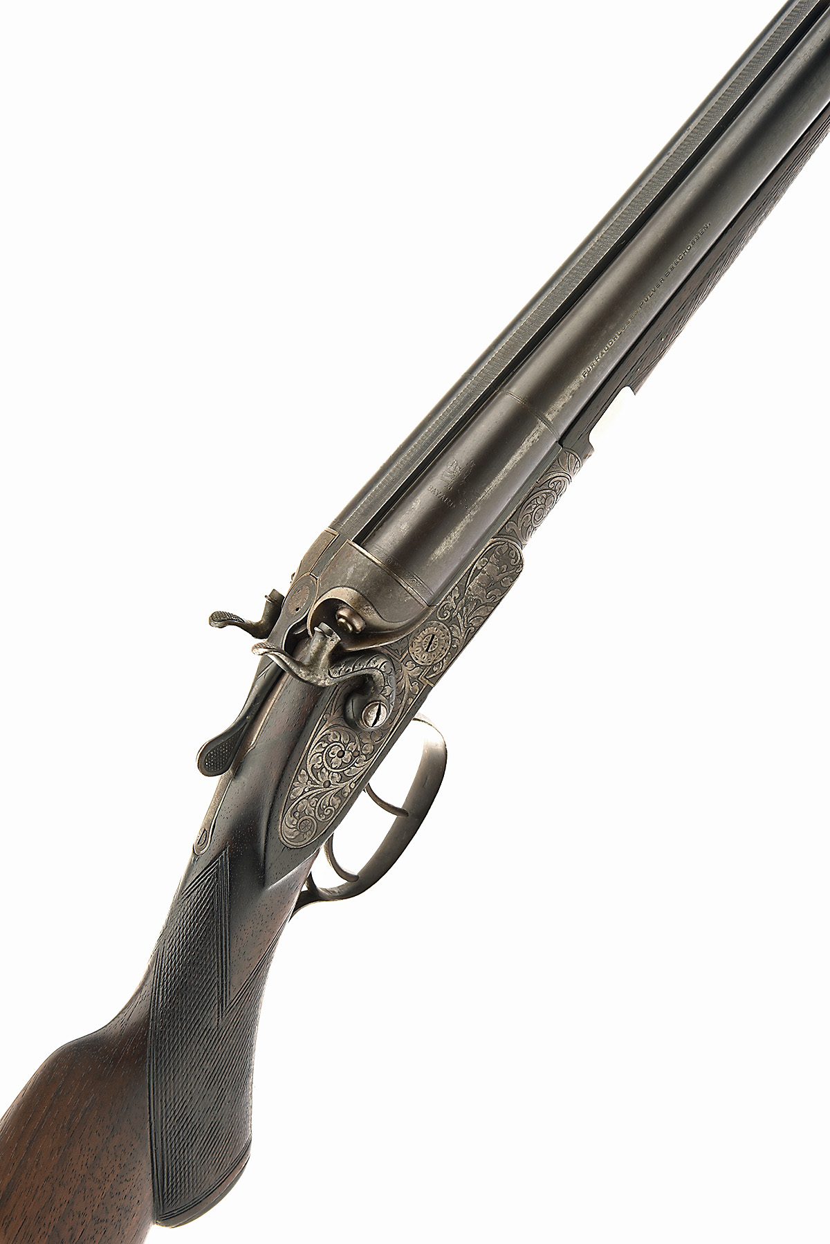 circa 1920, 29in. nitro barrels, 2 3/4in. chambers, bored approx. imp. cyl. and 3/4 choke, treble-grip action, carved percussion fences, rebounding hammers, bold acanthus scroll engraving, 14 1/4in. pistolgrip stock with pistolgrip cap, cheekpiece, sling swivels, including buttplate;