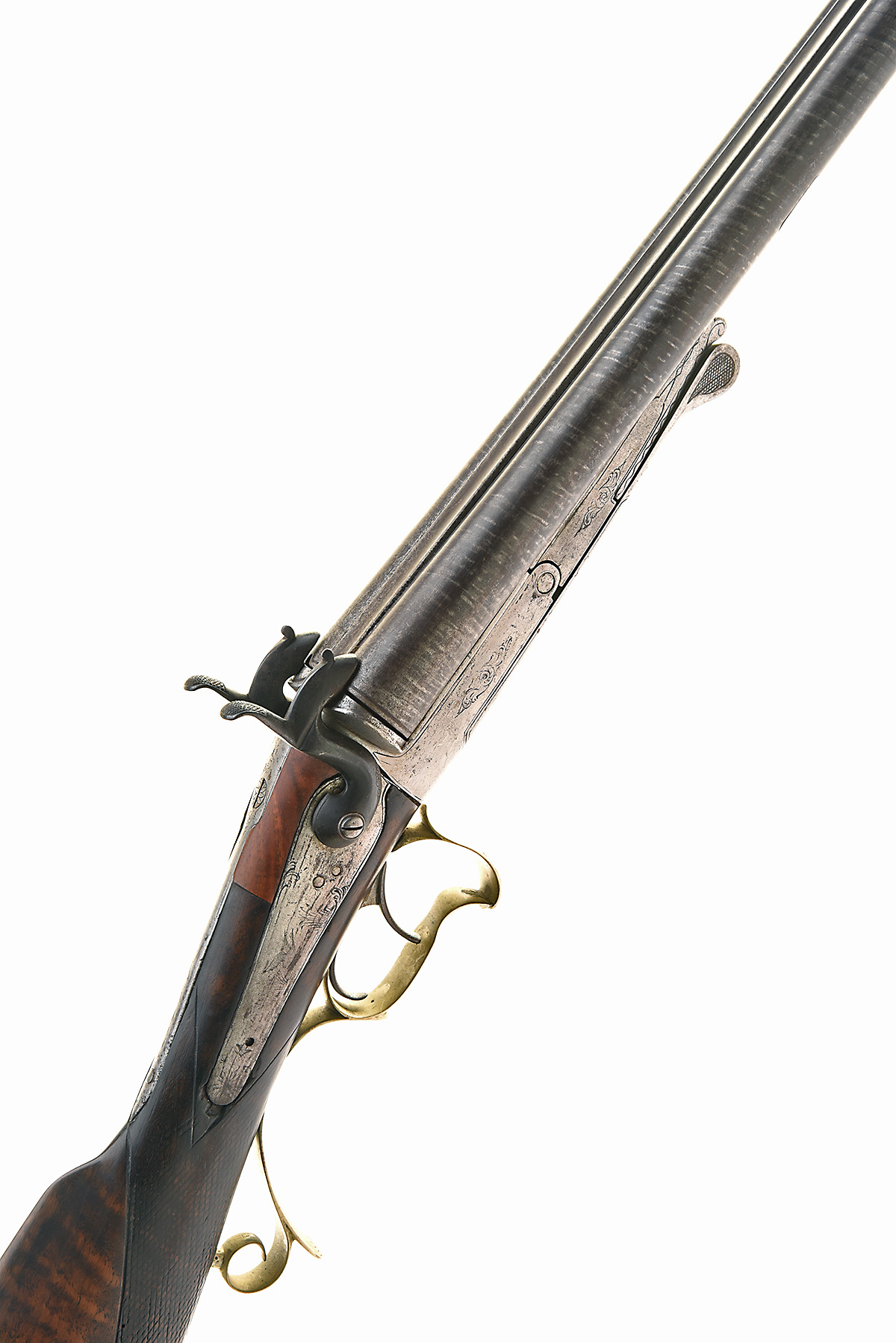 * A 12-BORE PINFIRE DOUBLE-BARRELLED SPORTING-GUN, UNSIGNED, serial no. 5286 circa 1865, with 30 1/2in. laminate barrels, engraved action with forward facing under-lever, engraved back-action locks, carved walnut butt-stock (inlet repair at head), nickel trigger guard and captive iron fore-end
