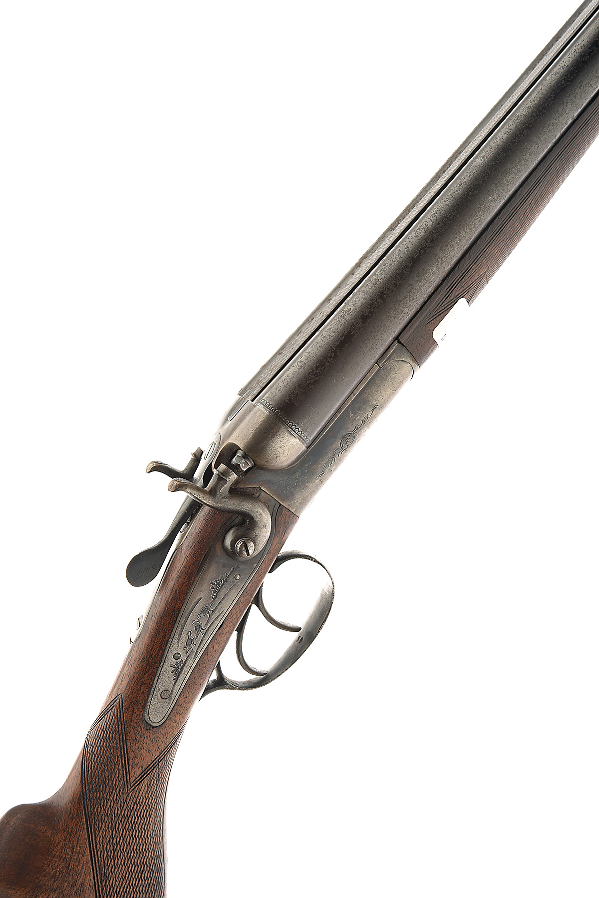 ** F. DUMOULIN & CIE 12-BORE TOPLEVER HAMMERGUN, serial no. 24805, circa 1933, 30in. nitro barrels, 2 1/2in. chambers, bored approx. true cyl. in both, treble-grip action, rebounding back-action sidelocks, border, partial scroll and naive game-scene engraving, retaining slight traces of original colour-hardening and finish, 14in. semi-pistolgrip stock including steel buttplate, sling swivels