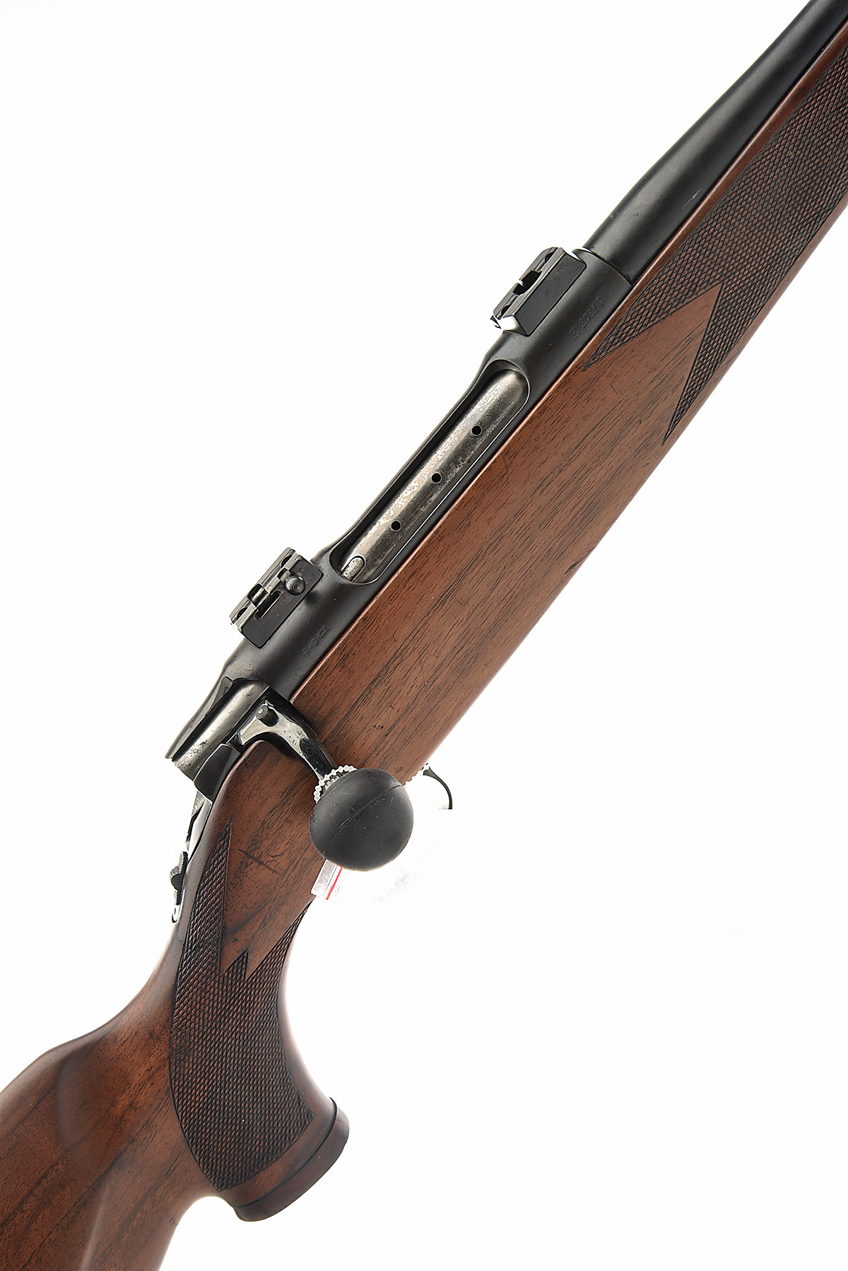 circa 1979, 23 1/2in. nitro barrel, ramp-mounted fore-sight, leaf rear-sight, tapped for apel mounts, ball bolt, manual tang safety. detachable magazine, well-figured pistolgrip stock with ventilated recoil pad and cheekpiece, sling eyes