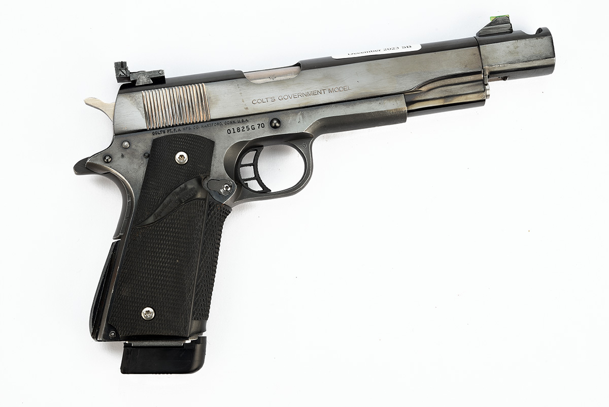 A COLT .45 (ACP) MODEL MKIV SERIES 70 GOVERNMENT CUSTOMISED PISTOL serial no. 01825G70, with compensated 6 1/2in. barrel, blued slide and frame, adjustable rear-sight and soft rubber Pachmayr grips