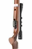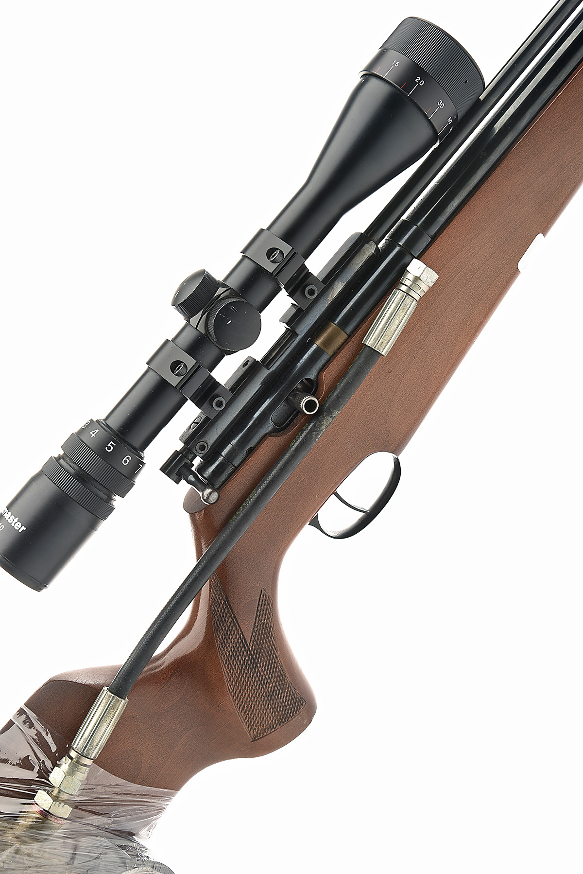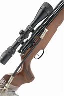 A .22 PRE-CHARGED PNEUMATIC AIR-RIFLE, SIGNED FALCON, serial no. 93383, 28 1/4in. unsighted barrel including Parker Hale sound moderator, receiver fitted with a Bushmaster 3-9x40 telescopic sight, blued air chamber (holding pressure), pistolgrip halfstock with cheekpiece, 14 1/4in. pull including ventilated rubber recoil pad, together with filler hose and guage