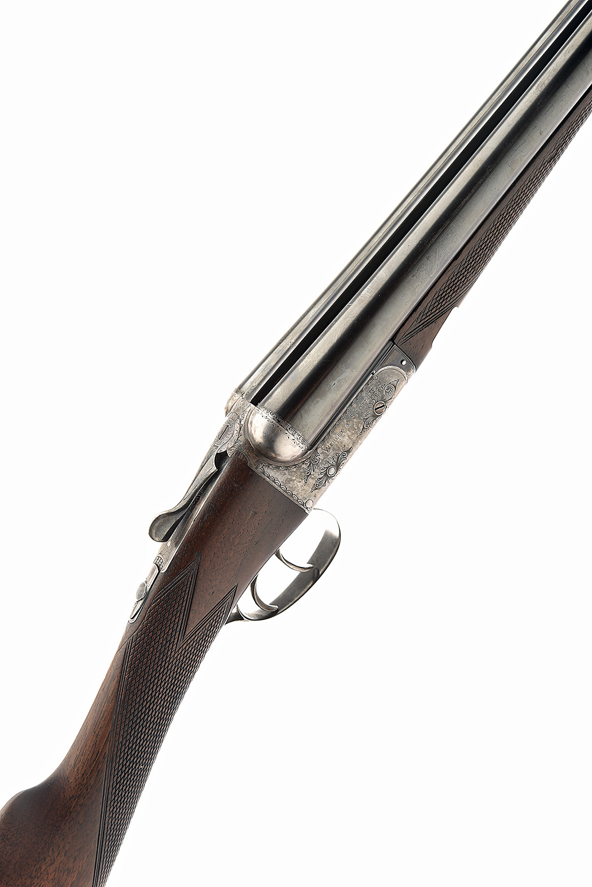 WEBLEY & SCOTT 12-BORE BOXLOCK EJECTOR, serial no. 118063, circa 1930, 30in. nitro barrels, the tubes engraved 'WEBLEY & SCOTT LTD. BIRMINGHAM.', 2 1/2in. chambers, bored approx. 1/4 and 1/2 choke, automatic safety with engraved 'SAFE' detail, border and partial acanthus scroll engraving, retaining slight traces of original colour-hardening and finish, 15 1/4in. stock including 1 1/8in. wooden extension, weight 6lb. 6oz.