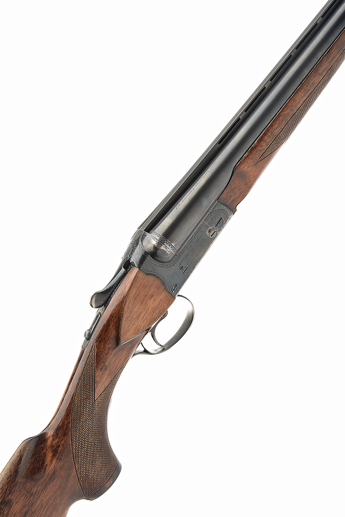 AYA 12-BORE 'MODEL MATADOR III' SINGLE-TRIGGER BOXLOCK EJECTOR, serial no. 449778, circa 1973, 28in. nitro barrels with ventilated matt rib, 2 3/4in. chambers, bored approx. 1/4 and 1/2 choke, automatic safety with gold-inlaid 'S' detail, removable striker discs, scoop-backed action with border engraving, blacked finish, single-trigger with barrel-selector switch, 14 1/4in. pistolgrip stock including trademark buttplate, beavertail fore-end, weight 7lb. 2oz.