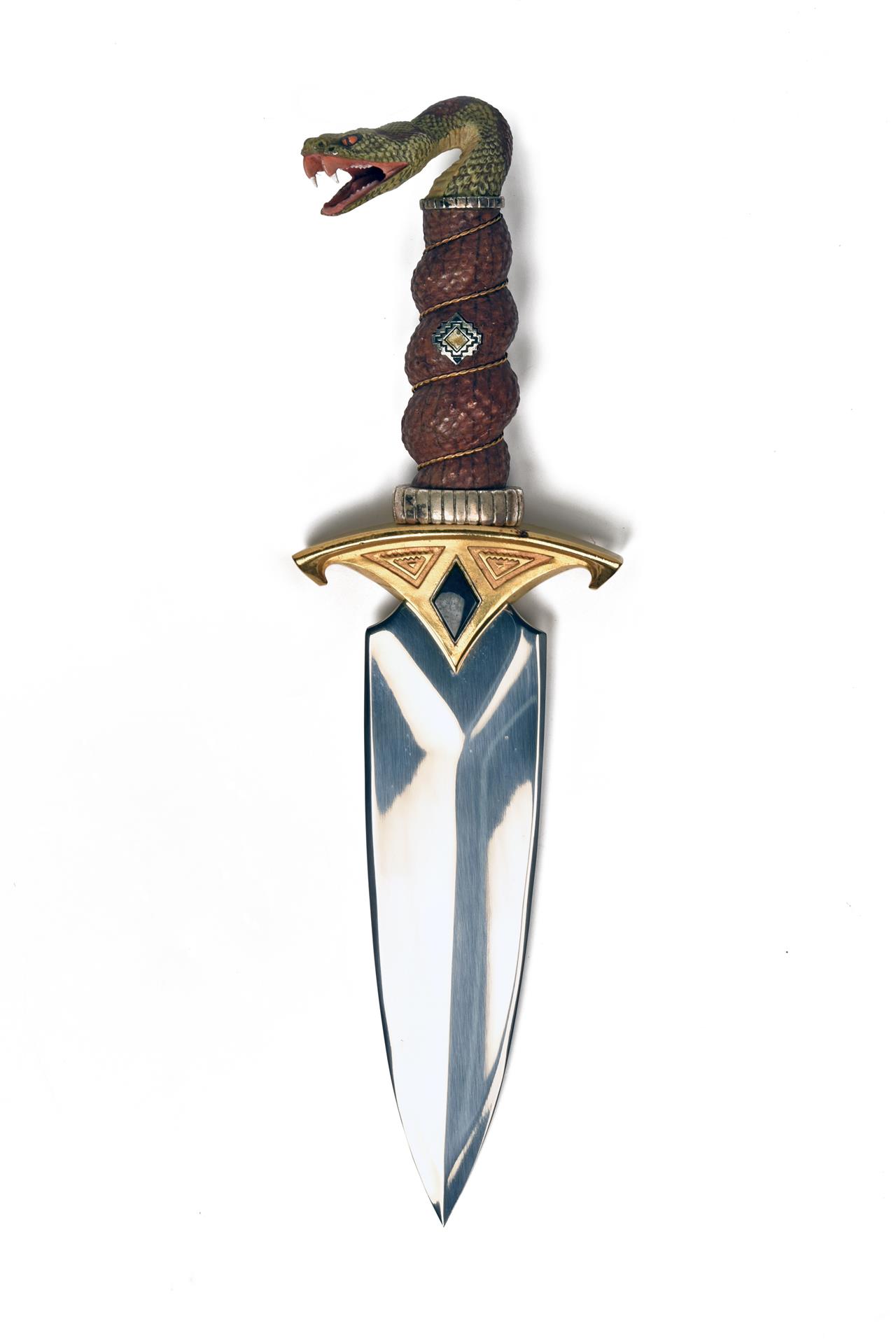 A GROUP OF THREE MODERN KNIVES, being 1) a Chinese-made fantasy dagger with a 8 in. nickel steel double-edged blade and plastic hilt with striking snake pommel, 14 in. overall; 2) a skinning knife with 3 1/2 in, single-edged steel blade and brass and wood grips, some rusting, 7 1/2 in.; 3) a hunting knife with 5 in. hand forged single-edged blade with faux antler grips with brass mounts, some rusting, 9 in. overall