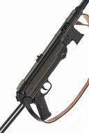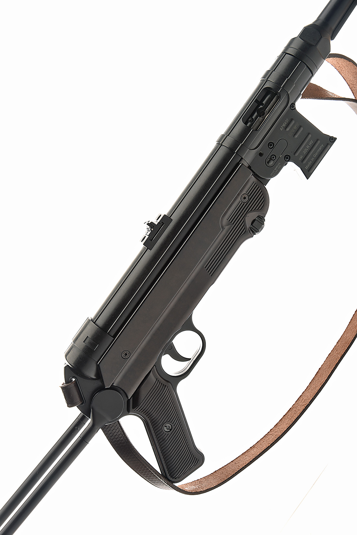 GSG .22 L.R. 'MP40' SELF-LOADING RIFLE, serial no. A716437, for 2015, 18in. nitro barrel with threaded muzzle shroud, ramped bead fore-sight (with spares), open rear sight, detachable magazine (with one spare), manual safety, ribbed fakelite pistolgrip plates and body covers, folding butt-stock, in a green take-down slip