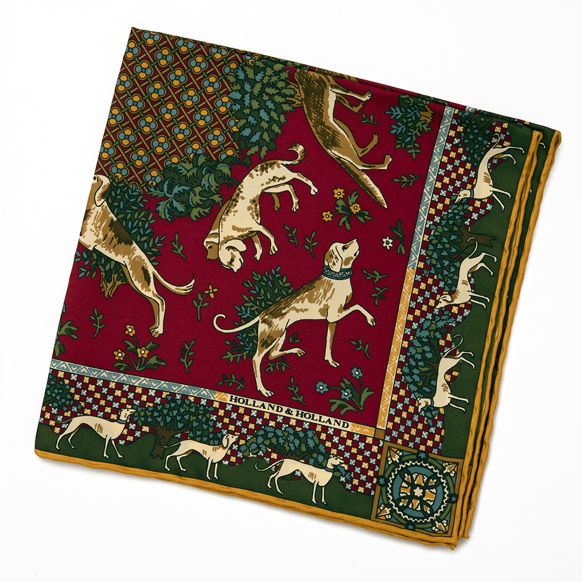 HOLLAND & HOLLAND SILK HANDKERCHIEF, dark red silk handkerchief with medieval hunting scenes, 16in. square