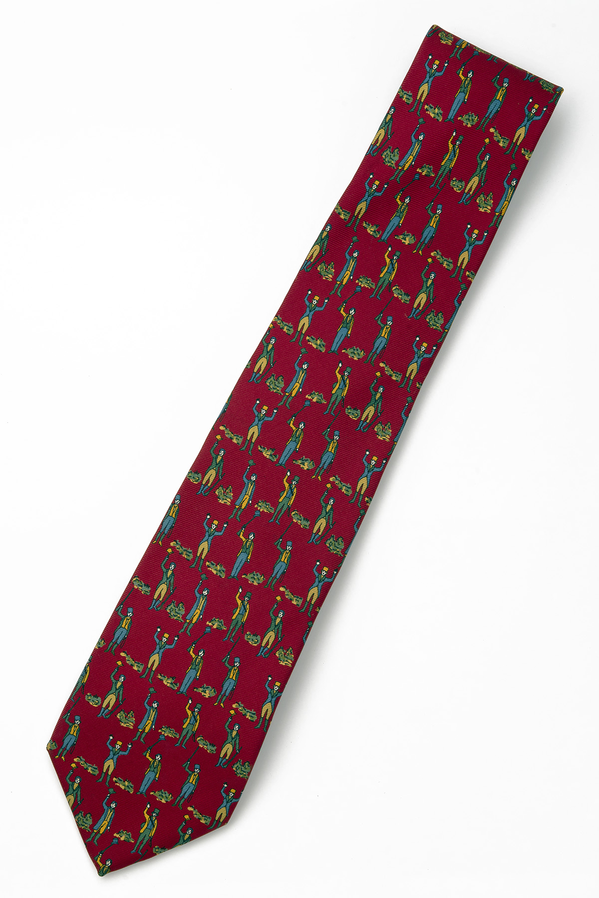 HOLLAND & HOLLAND SILK TIE, red silk neck tie with images of shooting gentlemen in a variety apparently gay and celebratory poses, 3 3/4in. width 58in. length