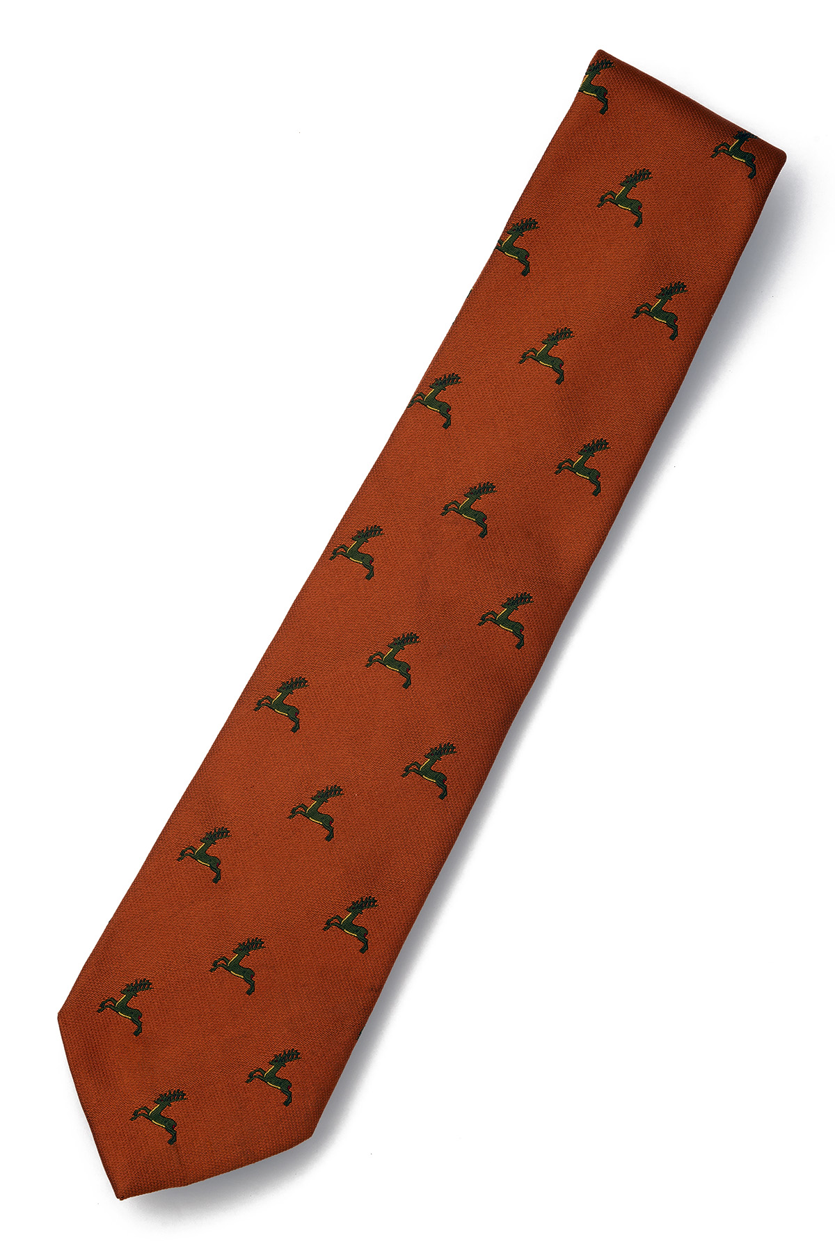 HOLLAND & HOLLAND SILK TIE, bright orange silk tie with repeat images of a stag, 3 3/4in. width 58in. length