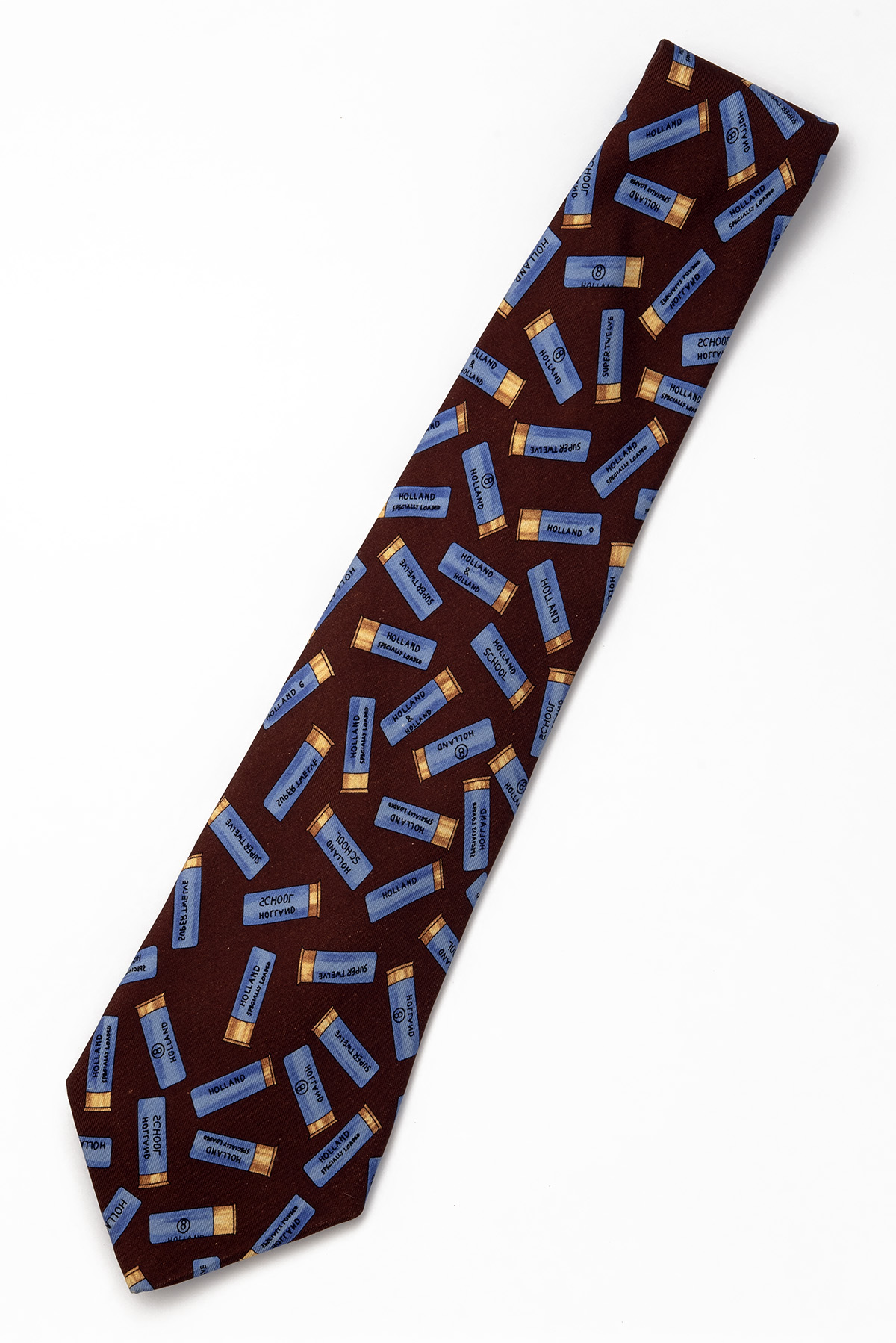 HOLLAND & HOLLAND SILK TIE, brown silk neck tie with images light blue and brass yellow cartridges, 4in. width 60in. length