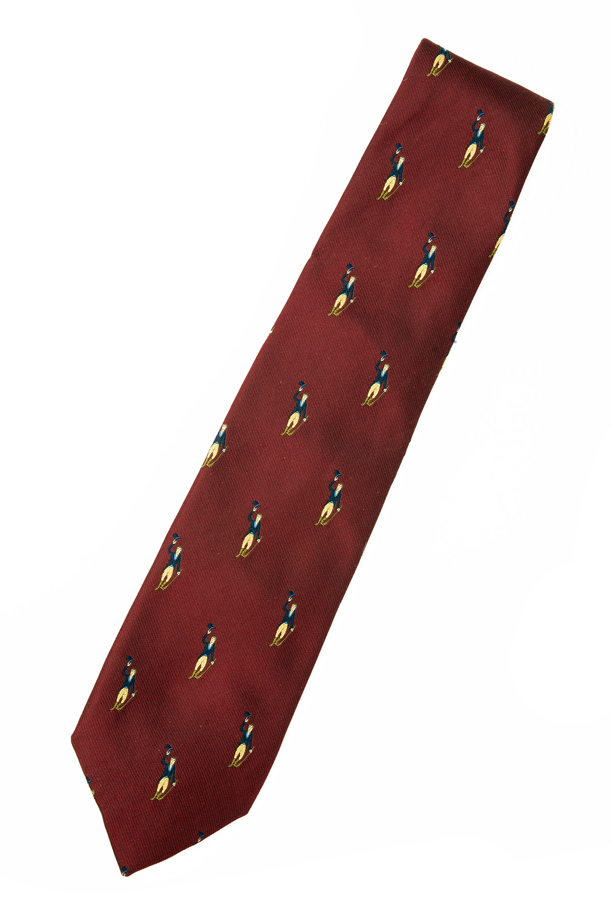 HOLLAND & HOLLAND SILK TIE, maroon silk neck tie with repeated image of shooting gentlemen with gun in hand and top hat raised, 3 3/4in. width 58in. length
