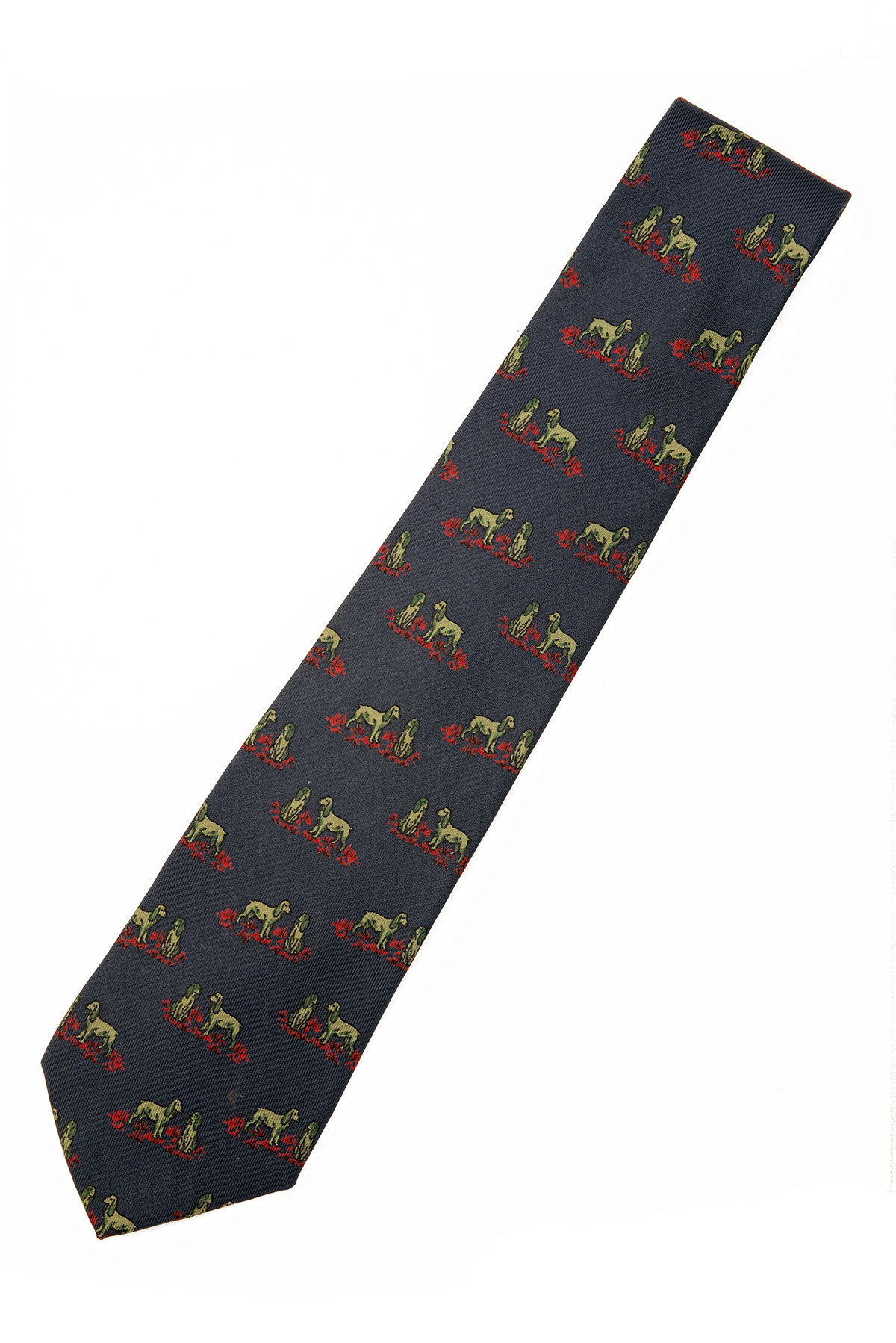 HOLLAND & HOLLAND SILK TIE, navy blue silk neck tie with repeated image of a pair of hounds, 3 3/4in. width 58in. length, keeper loop missing